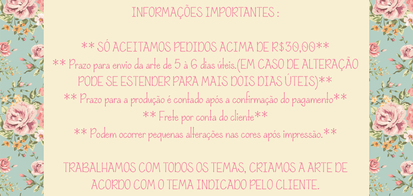 1. Horário de Atendimento: De segunda à sexta-feira das 10:00 às 17:00 h Não atendemos aos sábados, domingos e feriados . Os e-mails ou comentários dentro do pedido serão respondidos de segunda à sexta das 9:00 às 11:00h. Fora esse horário estamos na produção. QUANTIDADE MINIMA PARA CADA PRODUTO 20 PEÇAS. *************************************** 2. Arte: (NÃO ENVIAMOS A ARTE ANTES DO FECHAMENTO DO PEDIDO CONOSCO) Importante informar a data do evento assim como os dados da criança para personalização das artes no momento da compra. Caso não encontre o tema desejado entre em contato que confeccionamos ao seu gosto sem custo adicional. Usamos papel fotográfico e adesivo 180g para impressão das artes. Todo o trabalho é feito manualmente. HÁ GARANTIA DE FIDELIDADE DE CORES? - Infelizmente não por diversos motivos. O principal é que o que você vê em seu monitor dificilmente será o que vemos no nosso. O monitor tem luz própria já o papel depende de luz externa.. ****************************************** 3. Prazo de entrega: A arte será enviada em até 10 dias úteis após a aprovação da arte. Prazo para envio da arte para aprovação de 1 à 3 dias úteis.( EM CASO DE ALTERAÇÃO PODE SE ESTENDER PARA MAIS DOIS DIAS ÚTEIS ) CONFECÇÃO DE LAYOUT NOVO 6 DIAS ÚTEIS Prazo dos correios depende da forma de envio escolhido pelo cliente. O rastreio da carta registrada só sofrerá alteração no dia em que o objeto sair para entrega ao destinatário. PRAZO FINAL: ARTE + PRODUÇÃO + PRAZO DOS CORREIOS. (contando-se somente dias *úteis*) *************************************** 4. Pedidos sem atualização serão cancelados em 3 dias, mas caso o cliente decida pode refaze-lo a qualquer momento. **************************************** 5. Trabalhamos com o serviço de coleta dos correios... Após postada a encomenda, ficamos sujeitos a política do mesmo, não nos responsabilizamos por atraso dos Correios, greve, perda, furto ou qualquer outro problema decorrente da entrega. ATENÇÃO AO DIREITO DE ARREPENDIMENTO: Trabalhamos com produtos personalizados, o cliente informa o que deseja, suas medidas, o que irá escrito e o tema. O produto é feito desta maneira e pode ser cancelado ou pedido o estorno do valor pago até o momento da impressão. Um vez impresso não há possibilidade de qualquer tipo de estorno. Você receberá o código de rastreio para acompanhar o andamento do pedido pelo site dos Correios e assim solicitar a indenização total pelo valor pago caso ocorra algum problema. Ciente deste fato não cabe ao cliente reclamações posteriores. ********************************************** 6. CASO O CADASTRO ESTEJA INCORRETO E O PEDIDO JÁ TIVER SIDO ENVIADO, O REENVIO É POR CONTA DO COMPRADOR. O CLIENTE AO ESCOLHER O FRETE AUTOMATICAMENTE JÁ É AUTORIZADO PELOS CORREIOS AQUELE ENDEREÇO E NÃO PODEMOS ALTERAR, POR ISSO PEDIMOS TOTAL ATENÇÃO. *********************************************