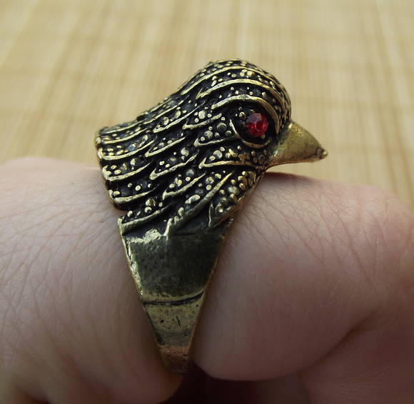 Anel ouro velho de águia, com detalhe de strass nos olhos.