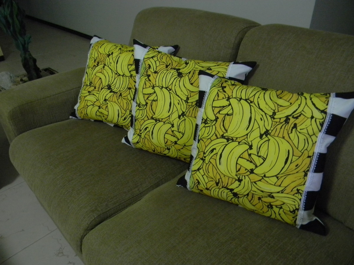 - Em tecido karsten, com tratamento antimofo e antimanchas, com estampa de bananas, e tecido Döhler listrado em preto e branco.