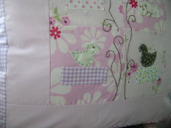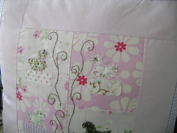 Apliques de pássaros e bordado.