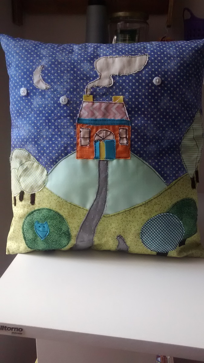 Almofada Patchwork. Produzida com tecido e manta acrílica. Costurado a máquina e a mão.