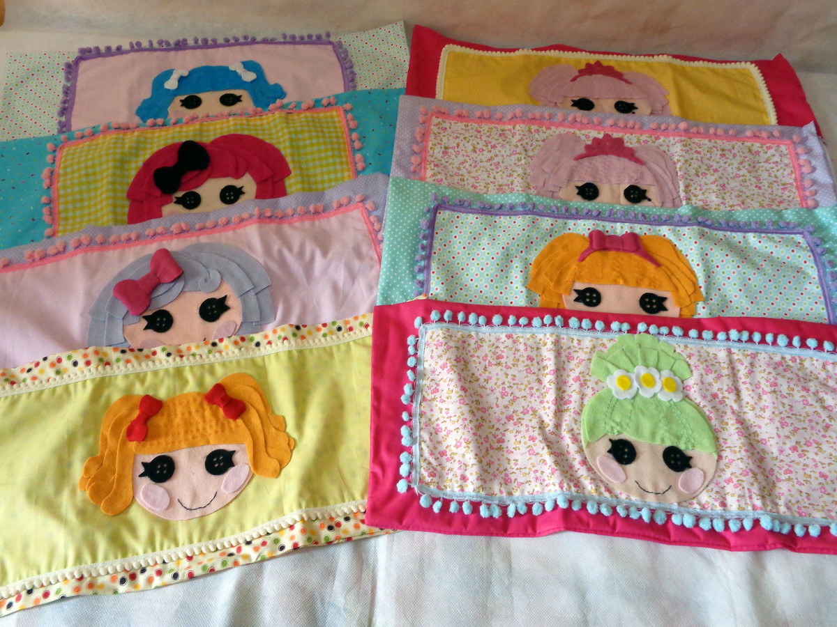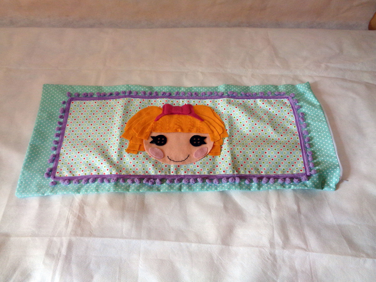 Almofada lalaloopsy retangular medindo 62 cm de comprimento por 25 de altura. (capa + enchimento)
