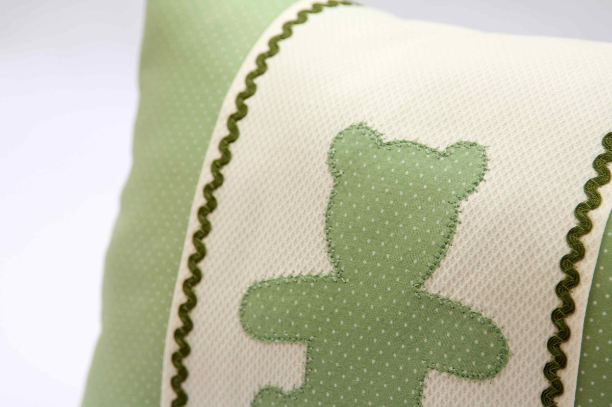 A faixa em piquê com aplicação é removível, e a capa da almofada é feita em tecido de algodão com fechamento envelope.
