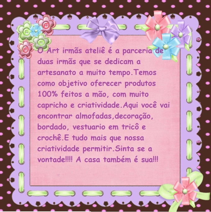 OS PEDIDOS RECEBIDOS QUE NÃO FOREM ATUALIZADOS EM ATÉ 7 DIAS APÓS O CONTATO INICIAL, COM ESCOLHA DE FRETE E OPÇÃO DE PAGAMENTO SERÃO CANCELADOS. O PRAZO DE CONFECÇÃO É CONTADO EM DIAS ÚTEIS (SEGUNDA A SEXTA, EXCETO FERIADOS ). O PRAZO DE ENTREGA (VIA PAC OU SEDEX) É CONTADO EM DIAS ÚTEIS E NÃO CORRIDOS. (SEGUNDA A SEXTA, EXCETO FERIADOS) DISPONIBILIDADE DE TAMANHOS E CORES: PARA ALGUNS PRODUTOS TEMOS TAMANHO E CORES PADRÃO. CASO QUEIRA ALTERAR MEDIDAS OU CORES, FAVOR ENTRAR EM CONTATO PARA VERIFICAR DISPONIBILIDADE. PEDIDOS RECEBIDOS NOS QUAIS O COMPRADOR NÃO INFORME COR OU TAMANHO, ENTENDE-SE QUE ESTEJA DE ACORDO COM O PRODUTO EM TAMANHO E COR PADRÃO. TROCAS E DEVOLUÇÕES: NÃO EFETUAMOS TROCAS NEM DEVOLUÇÕES; TIRE TODAS AS SUAS DUVIDAS ANTES DE EFETUAR A COMPRA E CERTIFIQUE SE QUE EXPLICOU EXATAMENTE TAMANHO E COR DE PRODUTO. SOBRE ENTREGAS; ENTREGAS NÃO EFETUADAS POR ENDEREÇO INCORRETO OU INCOMPLETO, CUJAS MERCADORIAS VOLTEM AO REMETENTE SÓ SERÃO REENVIADAS MEDIANTE NOVO PAGAMENTO DO FRETE POR PARTE DO COMPRADOR. ENCOMENDAS ENVIADAS QUE VOLTEM AO REMETENTE POR RESPONSABILIDADE DO COMPRADOR (DESTINATÁRIO AUSENTE, RECUSA NO RECEBIMENTO) SÓ SERÃO REENVIADAS MEDIANTE NOVO PAGAMENTO DO FRETE. NÃO NOS RESPONSABILIZAMOS POR POSSÍVEIS ATRASOS NA ENTREGA, POR RESPONSABILIDADE DOS CORREIOS. COMPRAS PARCELADAS TEM ACRÉSCIMO DE JUROS NAS PARCELAS. FIQUE ATENTO AO PARCELAMENTO DO PAGAMENTO DE SEU PEDIDO. PROGRAME SUA COMPRA COM ANTECEDÊNCIA, TRABALHAMOS COM PEÇAS FEITAS POR ENCOMENDA. ESTEJA ATENTO AOS PRAZOS DE CONFECÇÃO E ENTREGA.