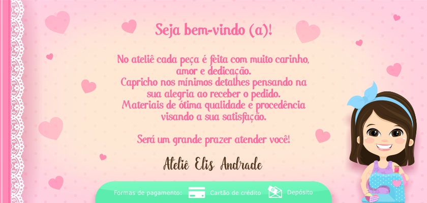 Os prazos mencionados nos produtos podem variar de acordo com a quantidade de encomendas recebidas no período. Para sua segurança, consulte os prazos antes de efetuar a compra! Antes de efetuar a compra, entre em contato e conheça as estampas disponíveis para o produto de seu interesse (nem todas as estampas mostradas na loja virtual ainda estão em estoque). As medidas enviadas para a produção das peças são de responsabilidade do cliente. Sempre que solicitadas, mande as medidas exatas. Como todas as peças são feitas por encomenda, não serão realizadas trocas nem devolução do valor pago, a menos que o produto apresente algum defeito de fabricação. Por se tratarem de produtos artesanais e únicos, podem ocorrer pequenas variações como a posição da estampa no produto, tonalidade dos tecidos e feltros, pequenas variações que irão alterar a qualidade da peça. Os dias de envio dos produtos para os correios são segundas e sextas-feiras! Encomendas de produtos a pronta entrega que não tiverem o pagamento confirmado em até 2 dias úteis serão canceladas. Não deixe de tirar todas as suas dúvidas antes de realizar o pedido! Estou à disposição. Sinceramente, Elis Andrade