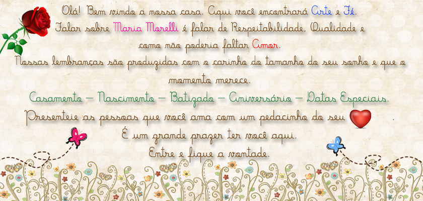 Nós do Ateliê Maria Morelli, não trabalhamos com estoque, pois todos os produtos são personalizados de acordo com o gosto de cada cliente, por isso veja nossos prazos e entregas. - Prazo de confecção é o prazo que estipulamos para confecção de sua encomenda - Prazo de entrega é o prazo que os Correios levam para entregar a sua encomenda - O prazo de confecção começa a ser contado a partir da confirmação do pagamento e confirmação de todos os detalhes do seu produto. - Cada produto possui um prazo de confecção diferente, por isso antes de comprar verifique essa informação na descrição do produto - A entrega depende do frete que for escolhido, sendo PAC entrega em até 8 dias úteis ou SEDEX entrega em até 3 dias úteis e SEDEX10 entrega no dia seguinte da postagem pela manhã. (Esse prazo pode ser variado dependendo da região de entrega) - Para todas as entregas informamos o código de rastreamento - Todos os produtos são postados com seguro - Tudo que produzimos é feito com carinho - Se você tem uma idéia fale conosco e vamos juntos tentar realizar com dedicação o seu desejo.