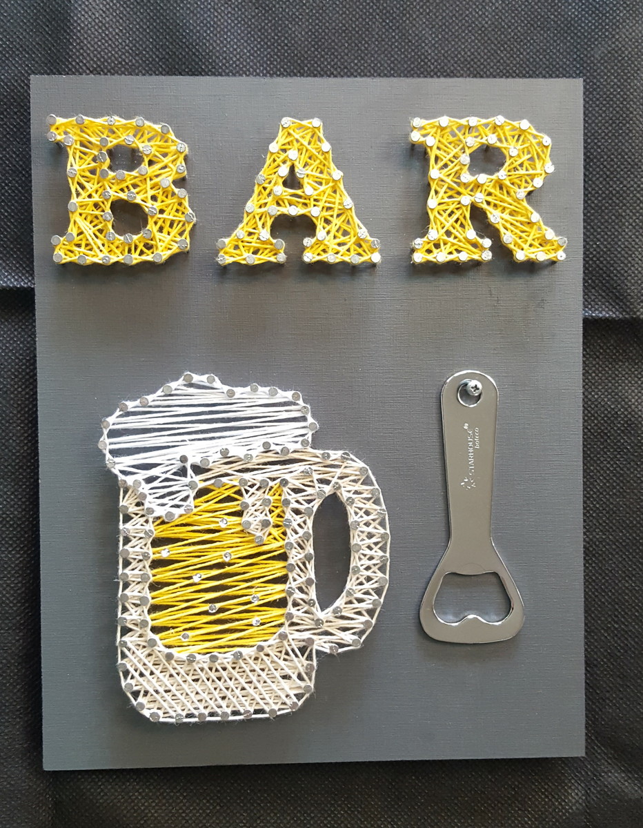 Quadro de String art com base de MDF, acabamento com pintura, acompanha um abridor de garrafa (modelo sujeito a disponibilidade)
