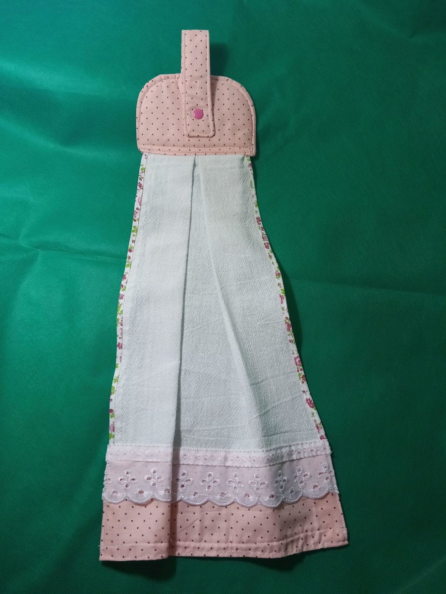 Bate mão 100% algodão feito com tecido de sacaria, com barrado em tecido de tricoline estampado e aplicação de aviamentos diversos.