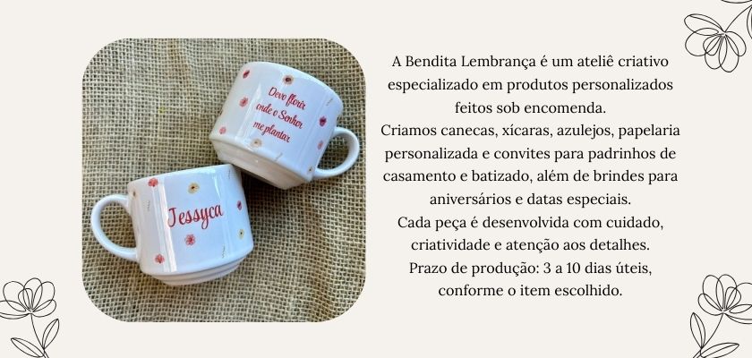 - Personalização Todos os produtos são feitos sob encomenda e personalizados conforme as informações enviadas pelo cliente após a compra. - Prazo de produção O prazo de produção varia de 3 a 10 dias úteis, dependendo do produto adquirido. O prazo começa a contar após a confirmação de todas as informações de personalização. - Aprovação da arte Quando necessário, a arte é enviada para conferência. A produção só inicia após a aprovação do cliente. - Trocas e devoluções Por se tratarem de produtos personalizados, não realizamos trocas ou devoluções, exceto em casos de defeito de fabricação ou erro no pedido. - Comunicação Estamos sempre disponíveis para tirar dúvidas antes e depois da compra. Fique à vontade para nos chamar pelo chat.