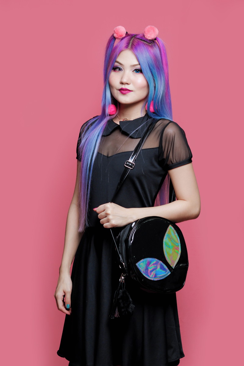 Bolsa Alien em material pvc vinil preto com aplicação de pvc holográfico prateado para os olhos,