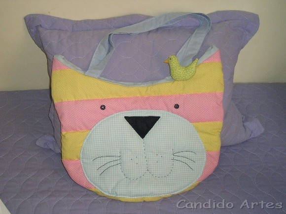 Linda bolsa em patchwork temática gato e pássaro, produto 100% artesanal em tecido, lavával,100% algodão e pré encolhido.