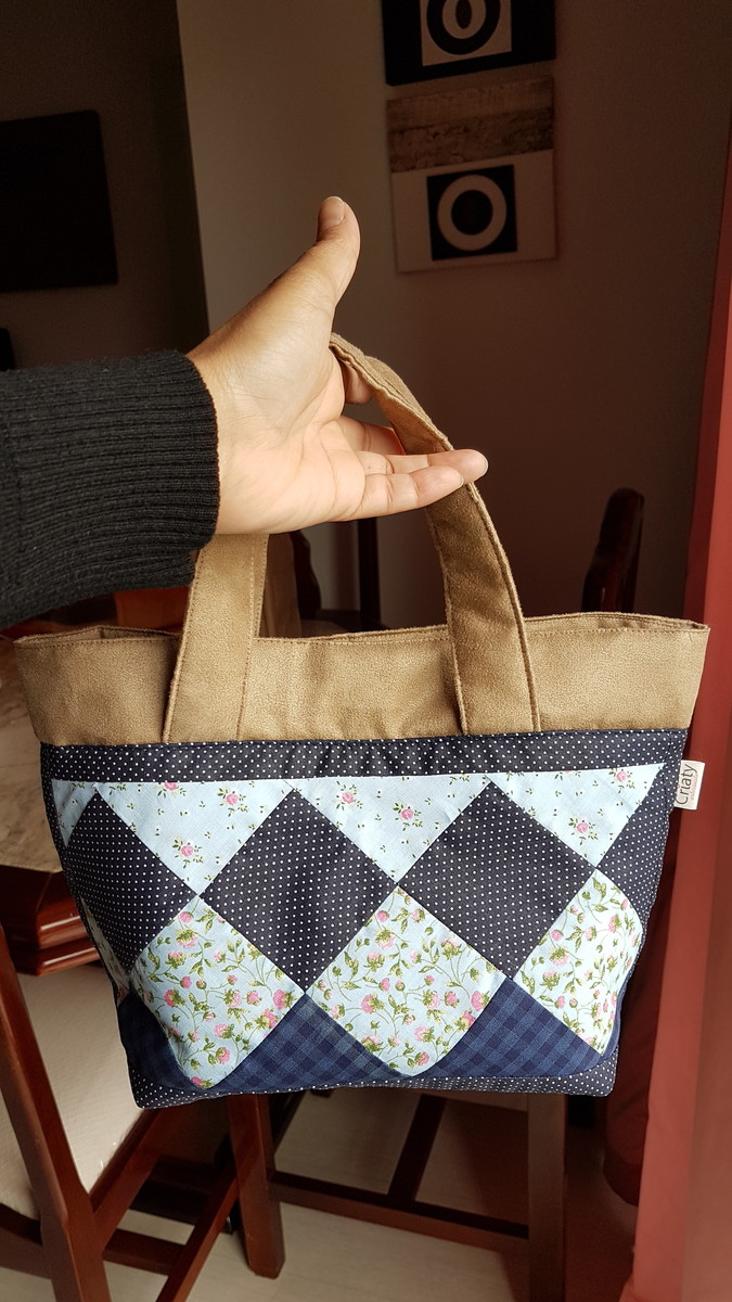 Uma linda bolsa de mão, feita com a técnica de patchwork.