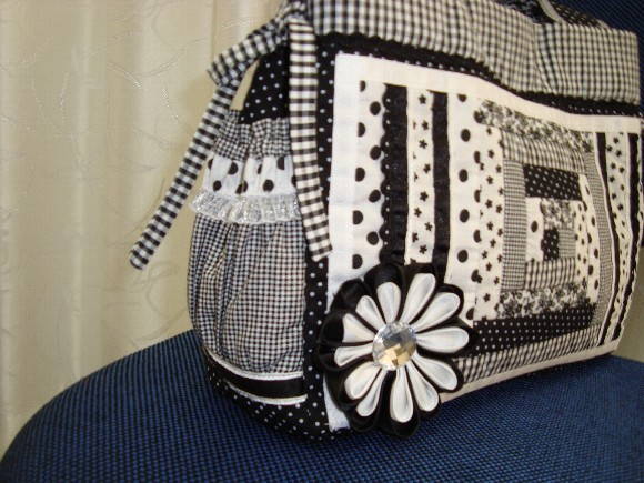 BOLSA DE PATCHWORK, COM FLOR DE KANZASHI. ELA TEM DOIS BOLSOS EXTERNOS BEM FOFINHOS, ELA É TODA ESTRUTURADA E FORRADA.NO SEU INTERIOR TEM DOIS BOSOS INTERNOS.