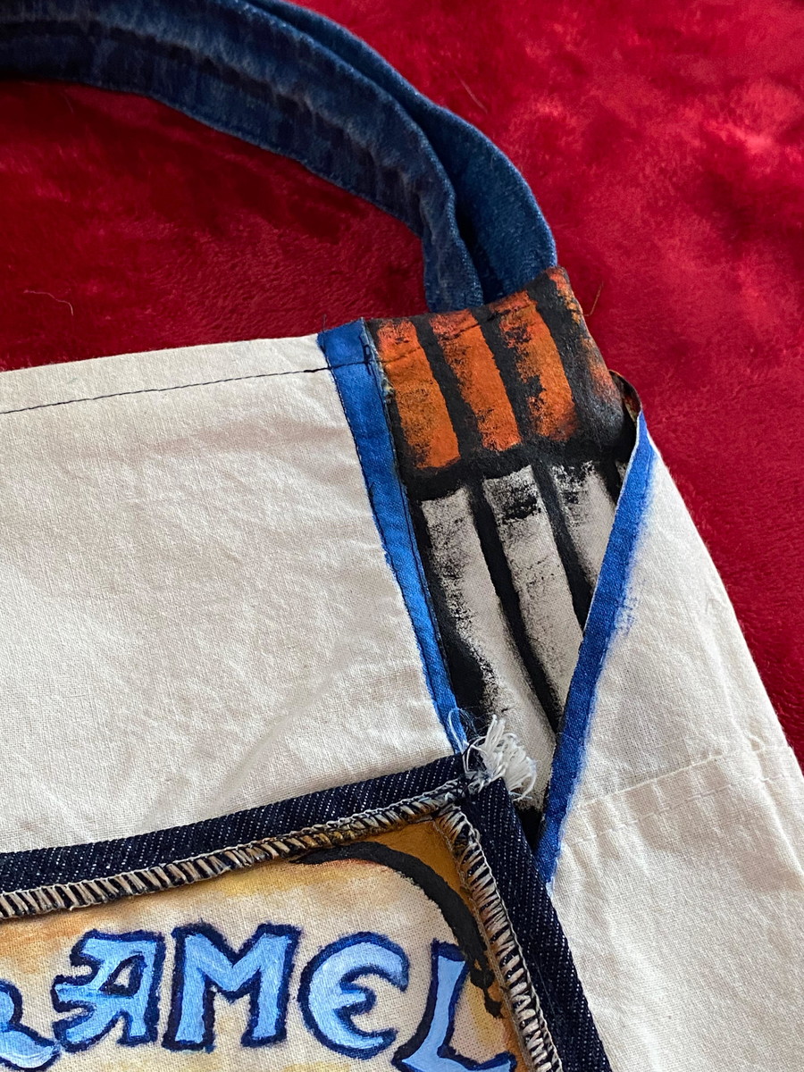 Produção slow fashion feita com retalhos de algodão cru e jeans, com bolsos na frente estampada/pintura manual.
