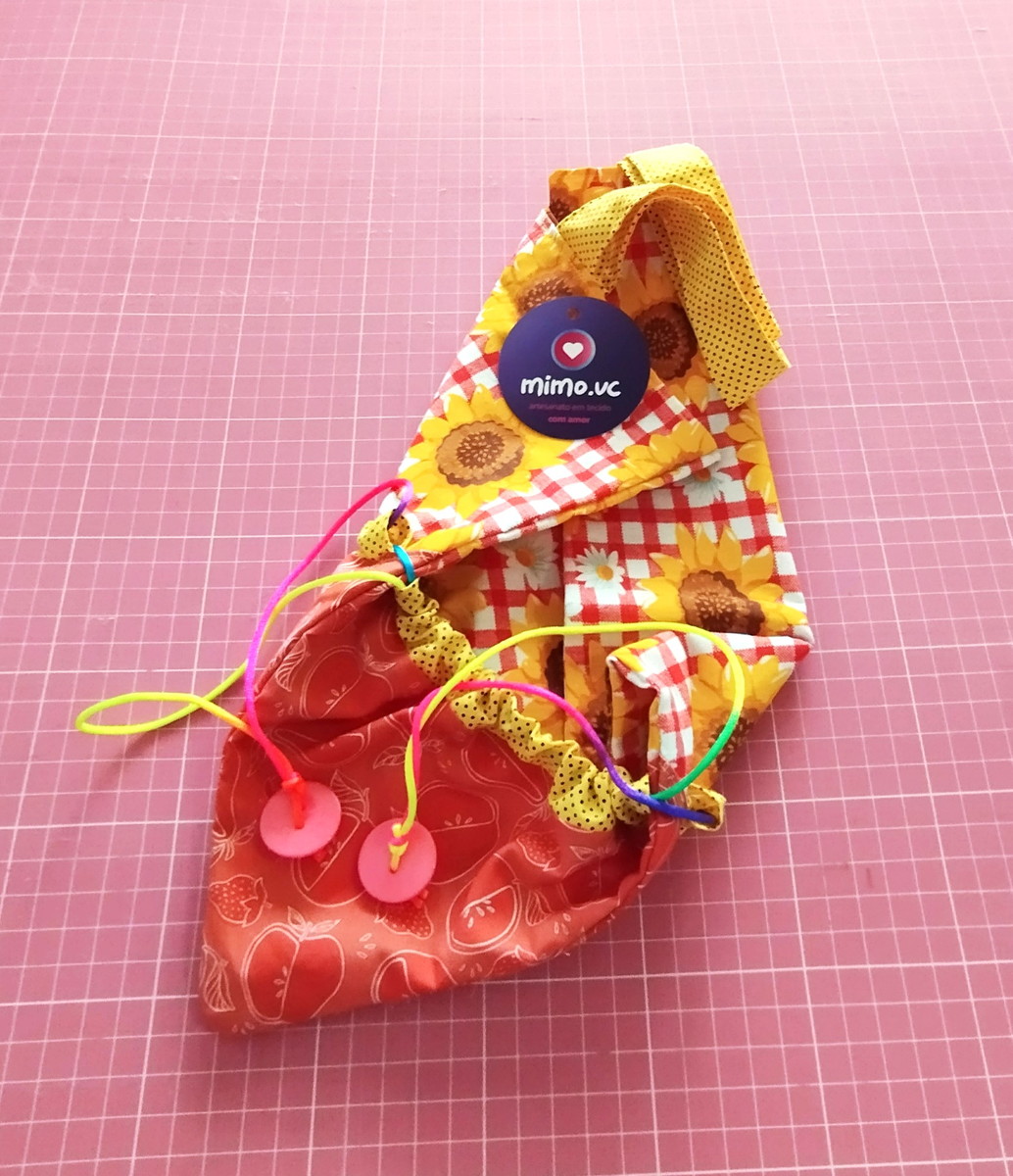 Linda Sacolinha reforçada em patchwork formato de coração com fechamento de cordão acetinado.