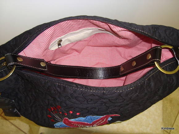 Bordada com aplicações de tecidos e rebordada com delicadas miçangas.