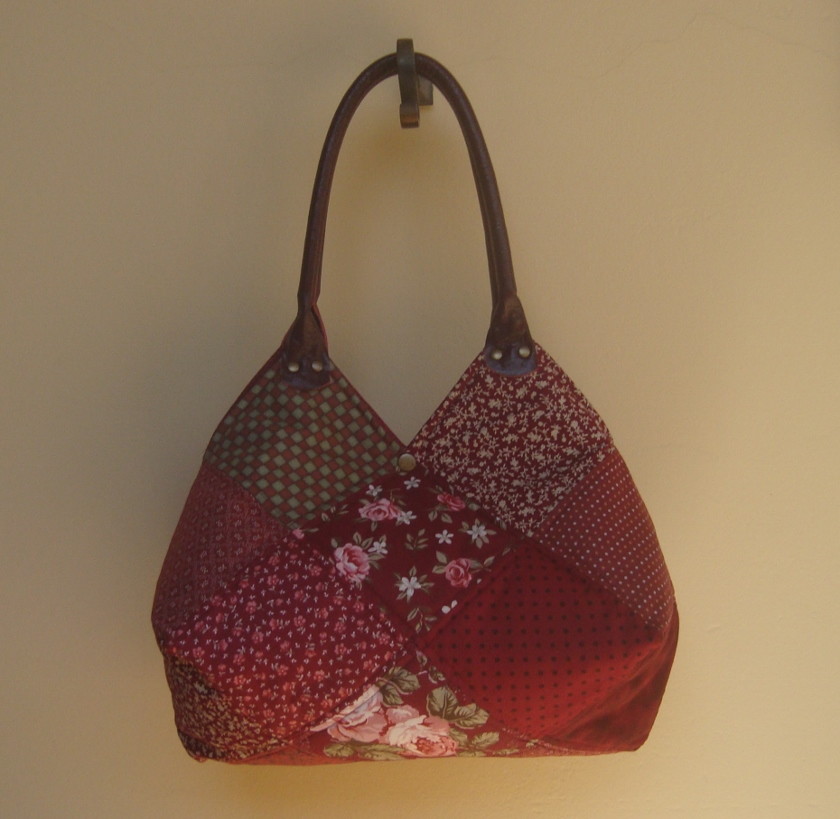 Bolsa em patchwork forrada, com bolso interno, fecho em botão de pressão e cabo em couro