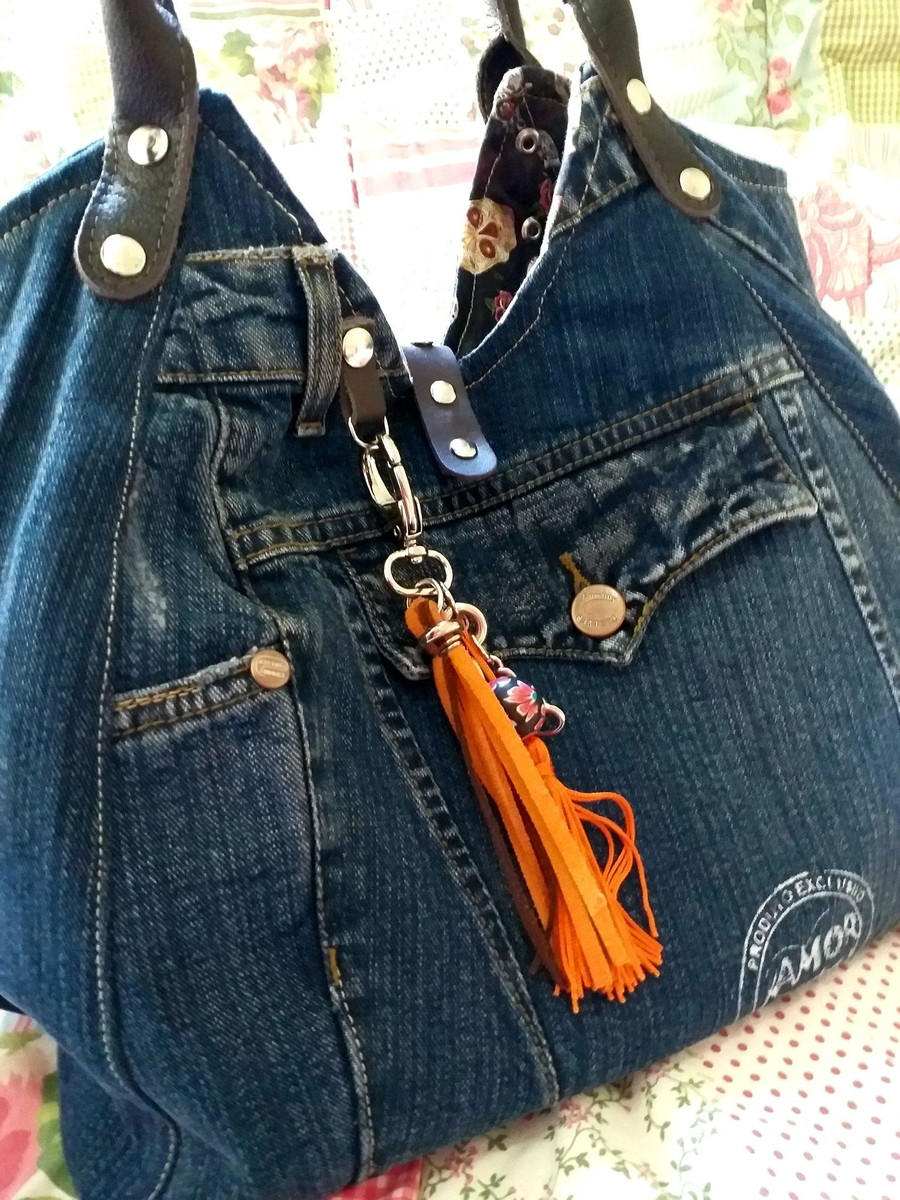 Bolsa em jeans, produzida com jeans customizado, alças de couro, forrada em tricoline, linda estampa, bolso externo, e bolso interno com ziper. Fechamento com ziper. Linda e estilosa, produto artesanal e exclusivo.