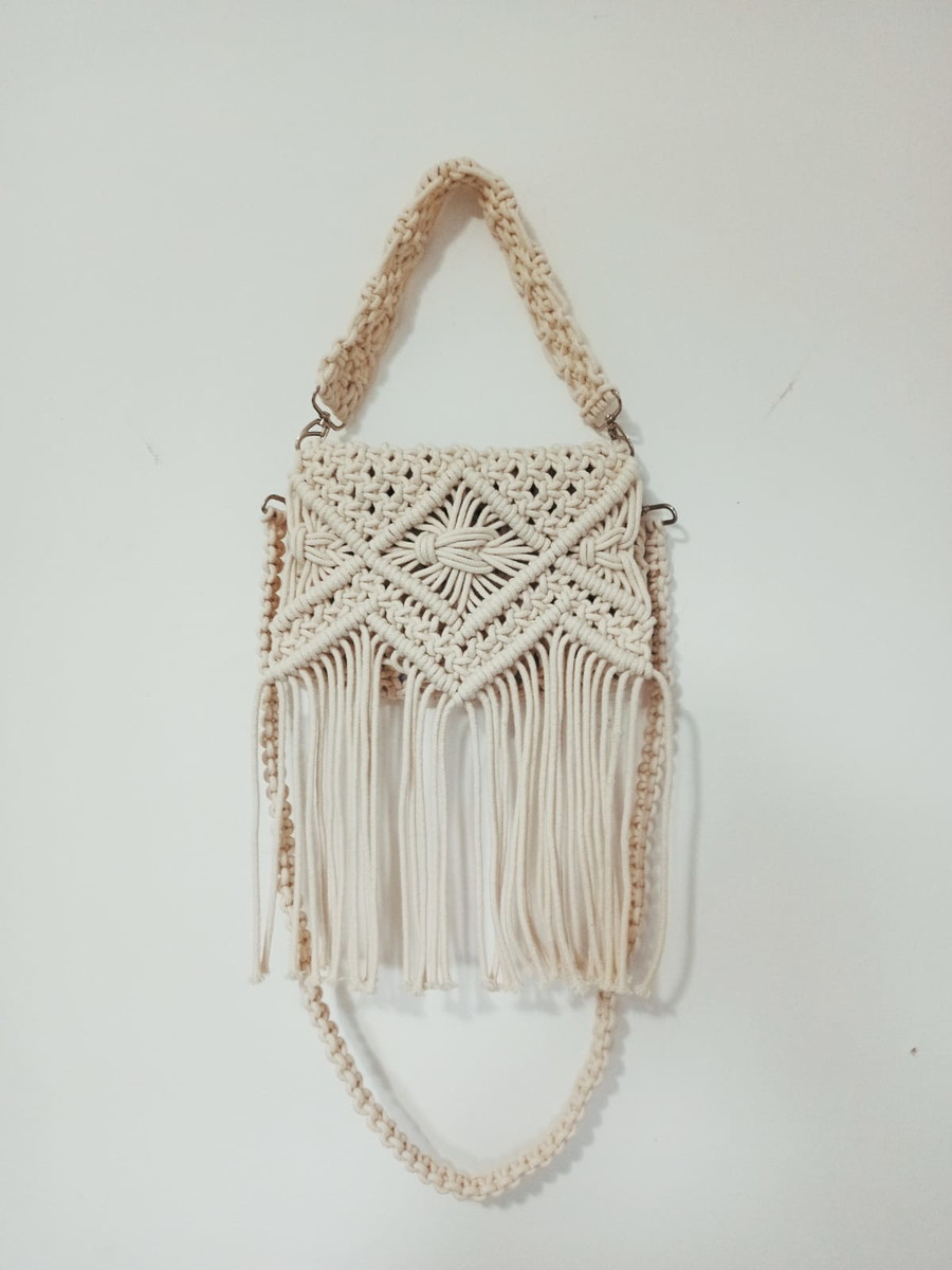 Bolsa artesanal em macrame produzida com cordão de algodão.