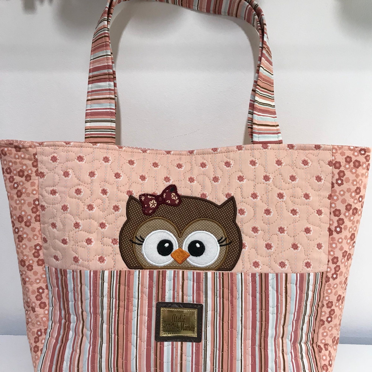 Bolsa patchwork em tricoline com aplique de coruja