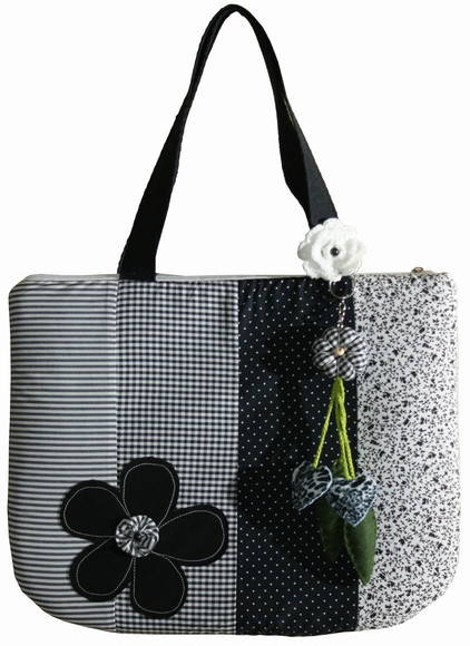 Bolsa em tricoline 100% algodão. Forro 100% algodão e revestida com material acoplado. Bolso interno com zipper. Penduricalho decorativo de flor em tecido e corações em feltro.