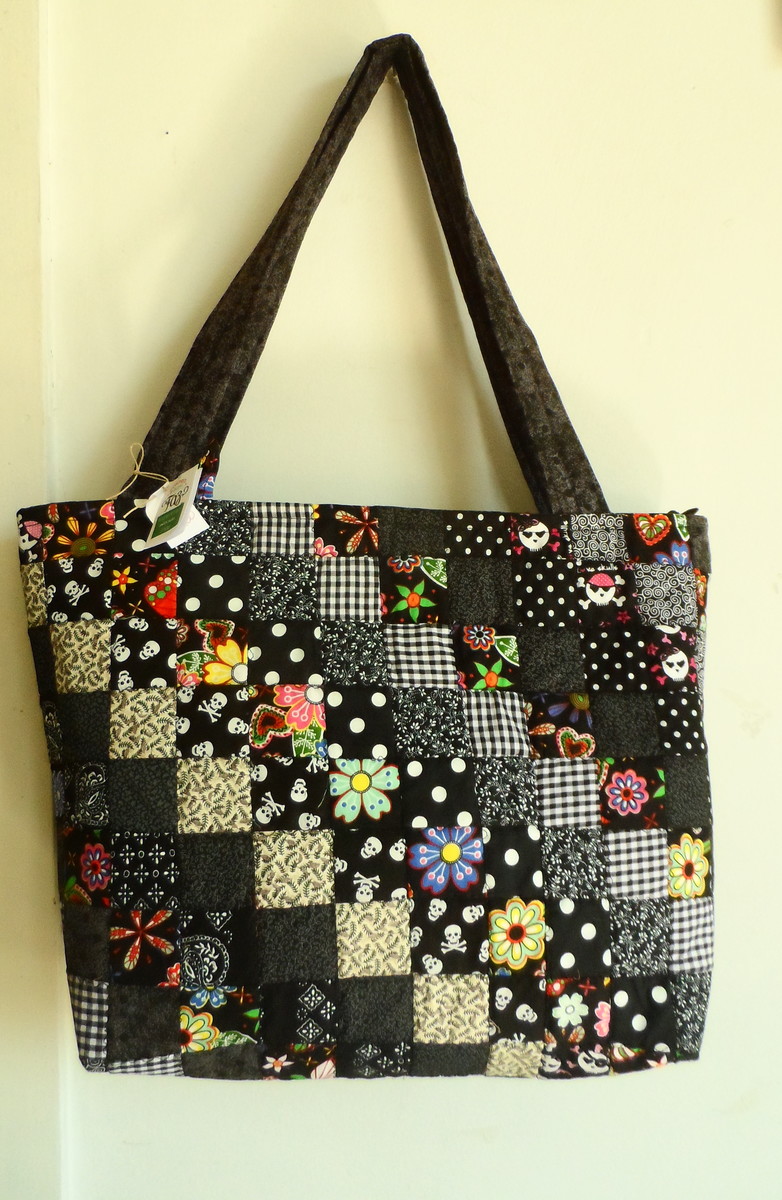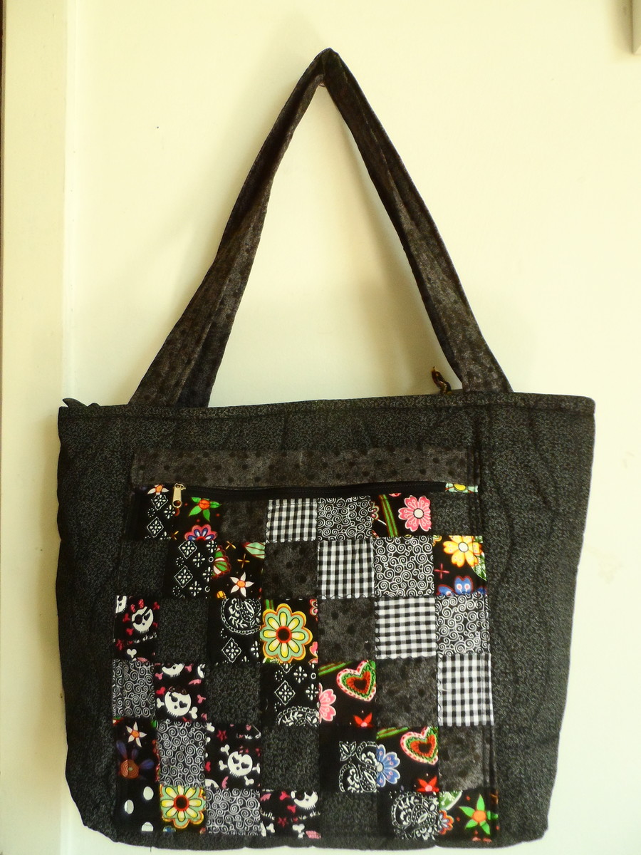 Bolsa em tecido, de um lado toda em Patchwork e do outro lado dois bolsos em Patchwork. Bolso interno e zíper.