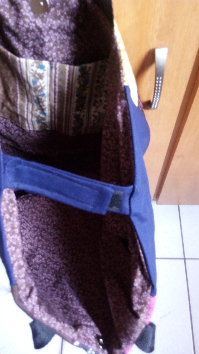 FORRADA COM MANTA, BOLSO INTERNO, VIRA UMA SACOLA. FECHAMENTO COM VELCRO E BOTÃO DE PRESSÃO.