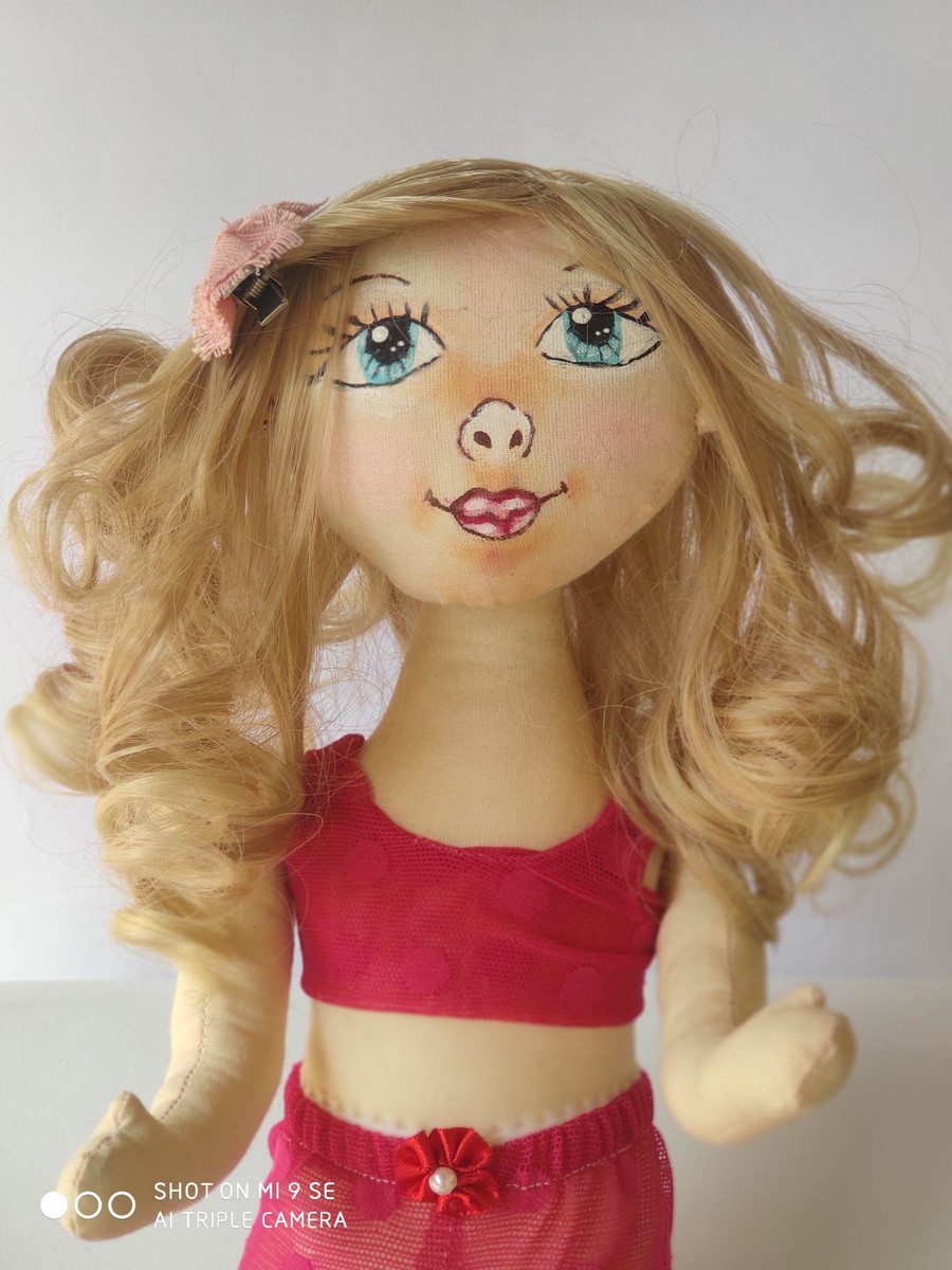 Boneca de pano articulada, cabelos sintético, rosto pintado com tinta de tecido usando top e meia calça, troca roupas. (Tem enchimento de pedrinhas de jardim no bumbum, para facilitar sentar.