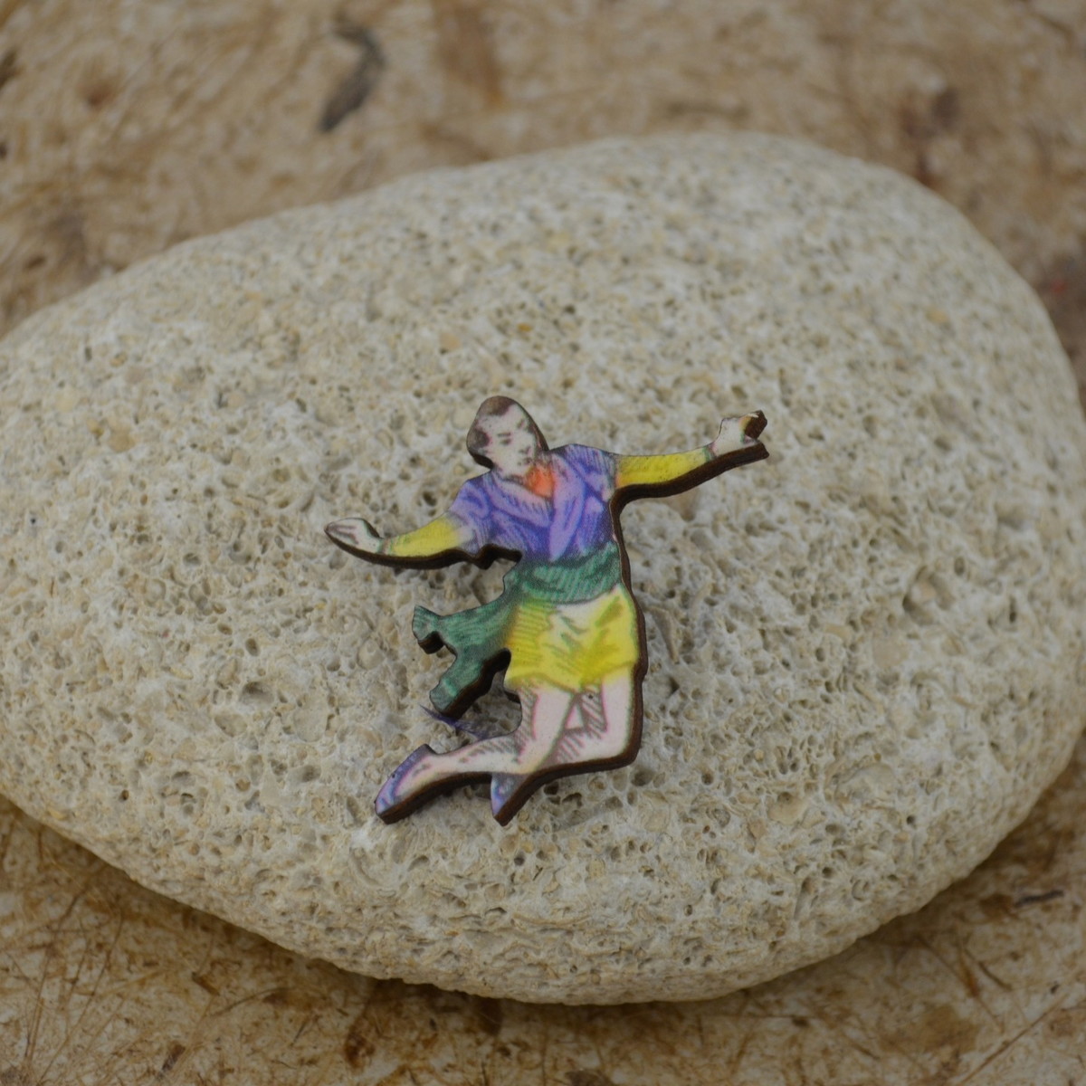 Broche personagem com o circo de madeira retro e várias camadas de verniz para proteger a imagem.
