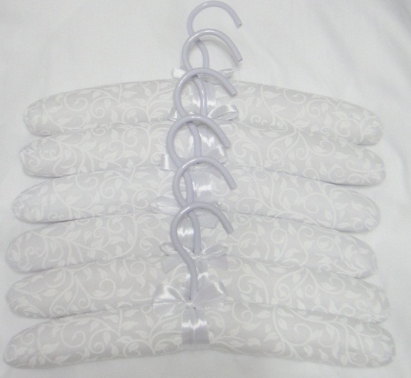 São cabides de madeira, revestido com espuma e tecido totalmente de algodão, fio 40 com acabamento com lacinho de cetim e embalagem.