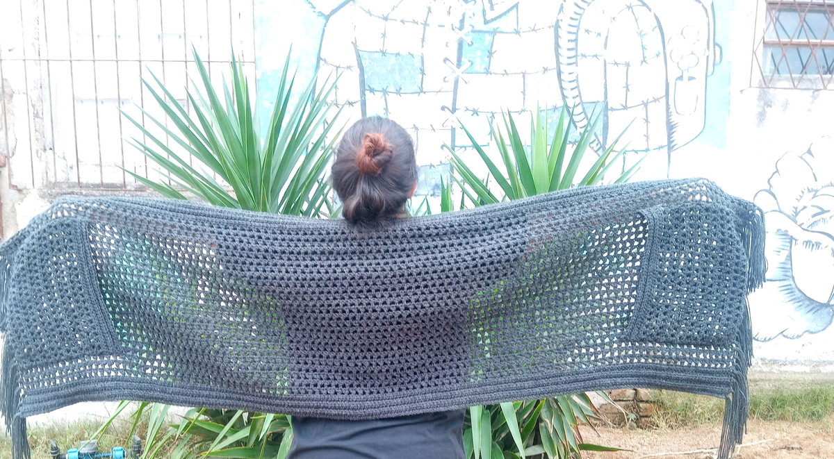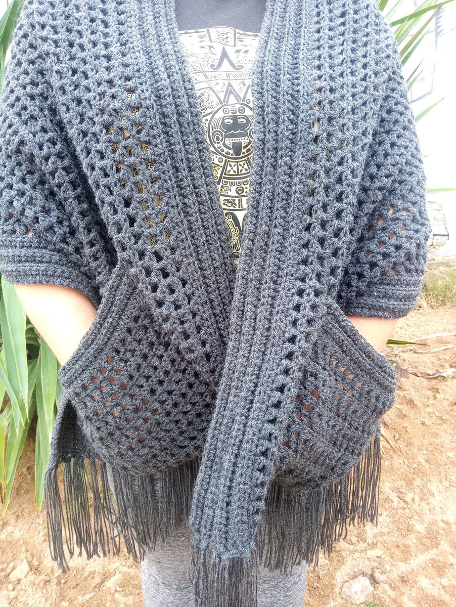 Cachecol com bolsos e franjas em crochê