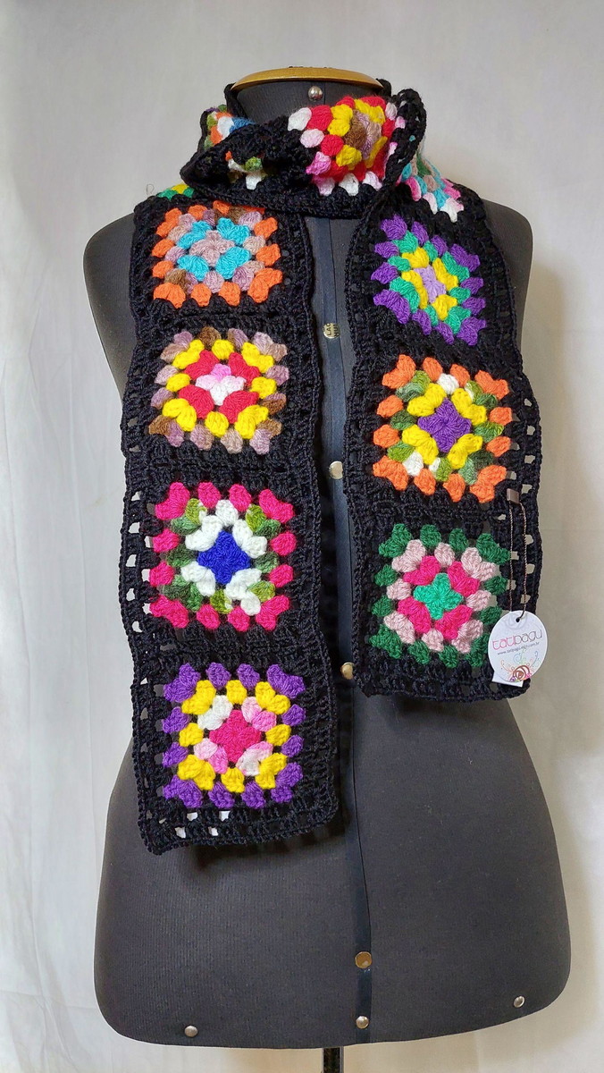 Cachecol feito com quadradinhos coloridos de crochê, leve e quentinho.
