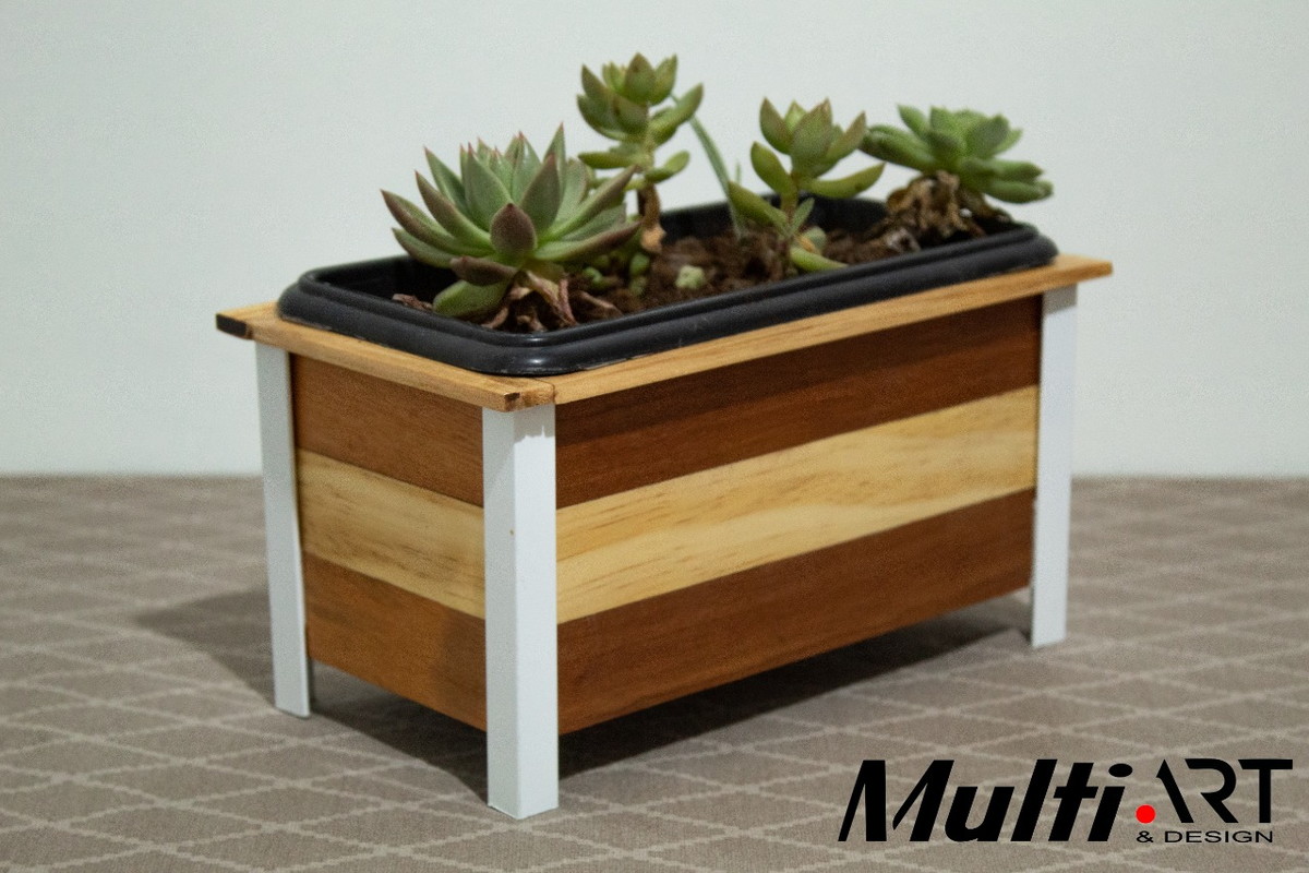 Cachepot feito em madeira, lixado e encerado com pés em alumínio, Vaso acompanha o produto, ideal para suculentas ou pequenas plantas.