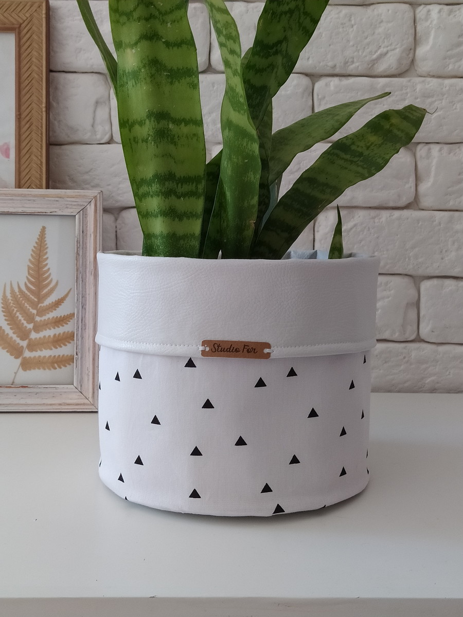 Cachepôt de tecido parte externa e couro eco na parte interna