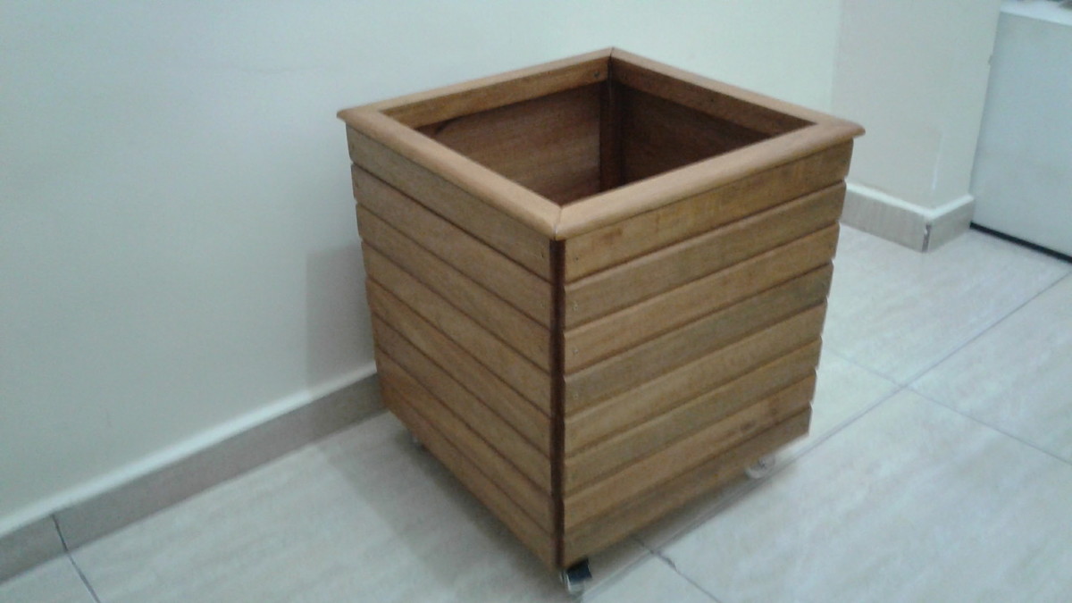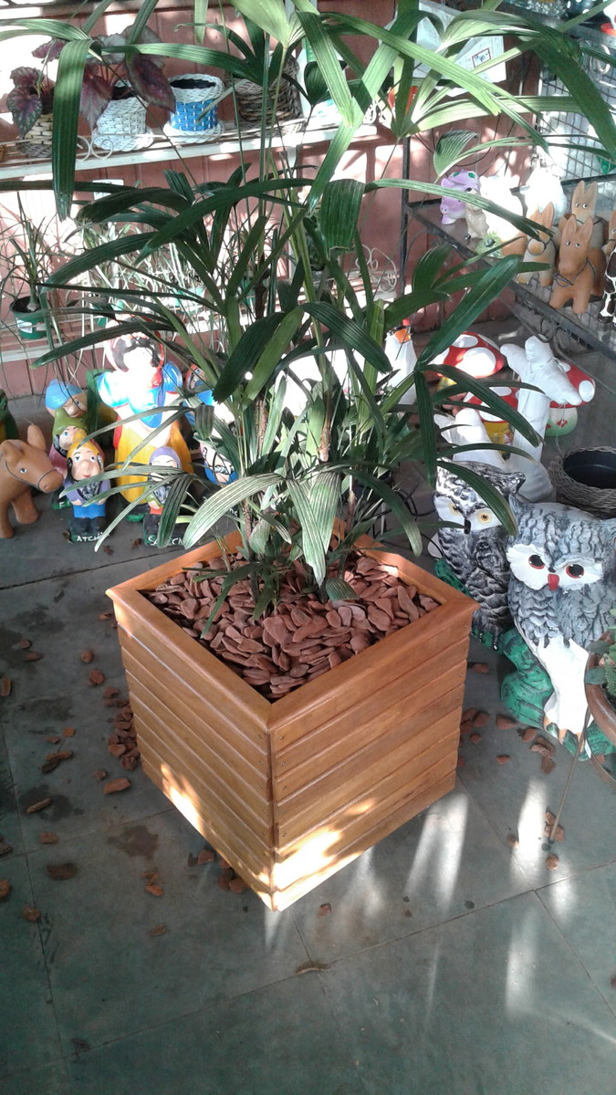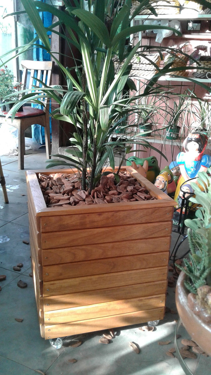 Cachepot fabricado em madeira com 04 rodízios, sendo 02 com freio.
