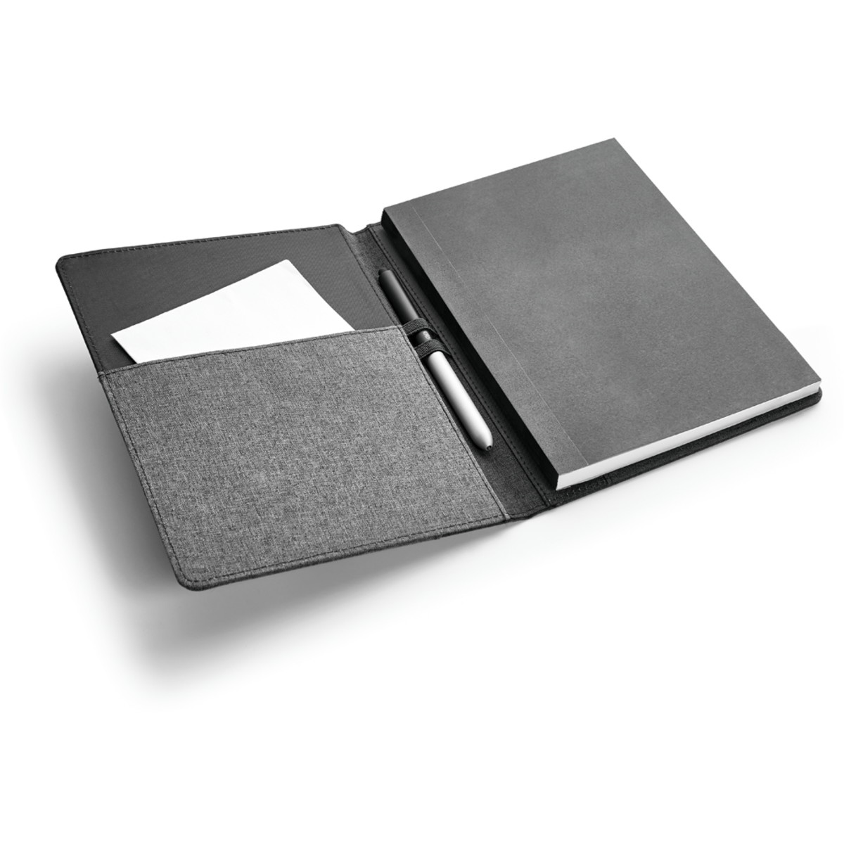 Caderno A5 (16 x 22) com capa removível ( tecido em poliéster ), com bolso interior + embalagem em TNT " liso ".