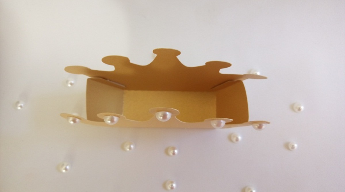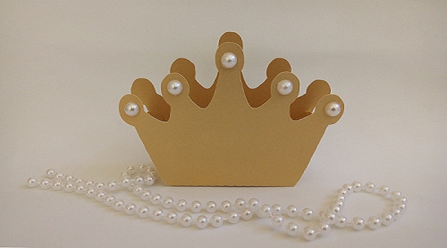 Linda caixa coroa com perolas das princesas, confeccionada em papel color plus dourado metalizado.