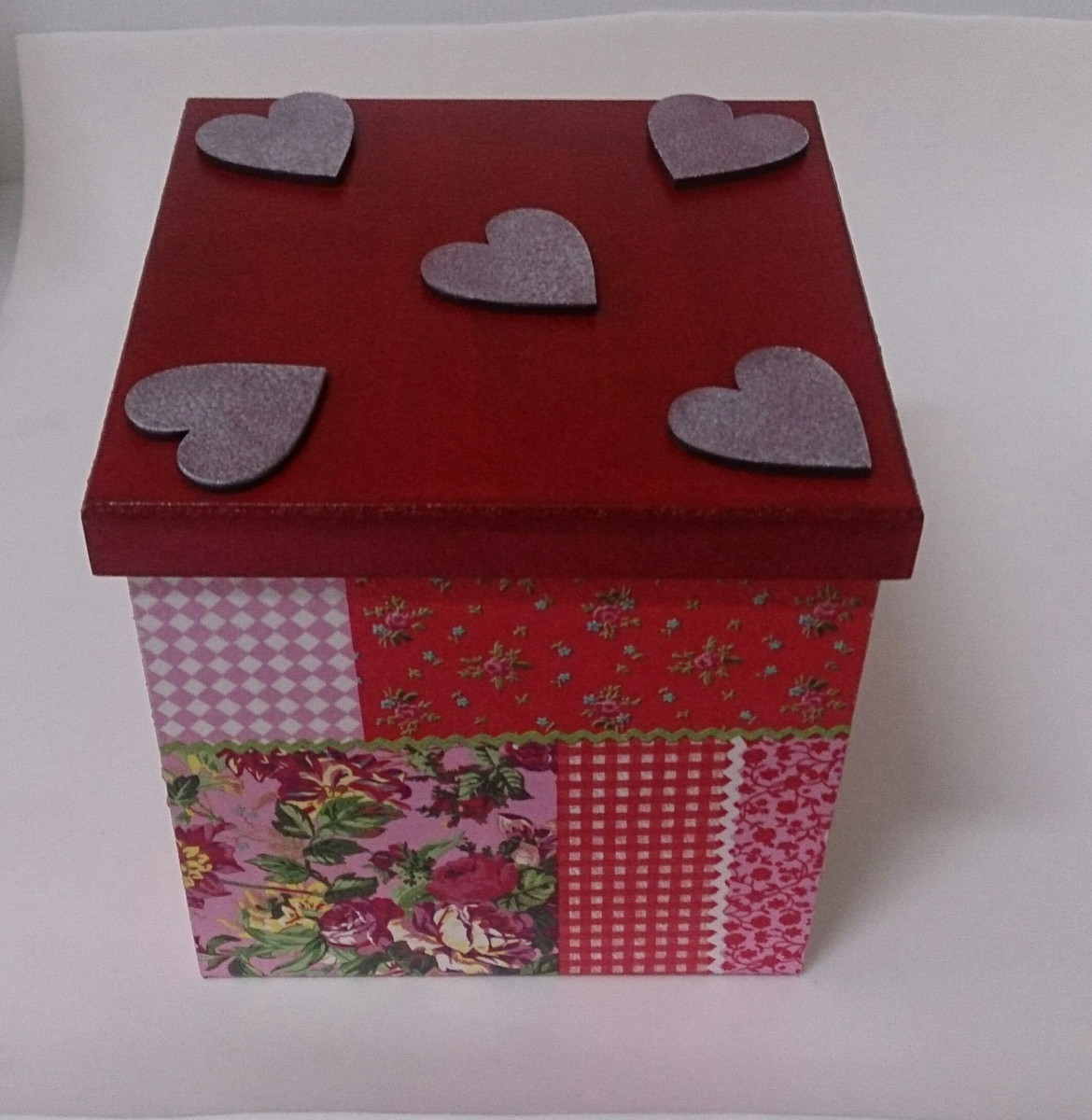 Caixa grande decorada vermelha com temática patchwork e corações.