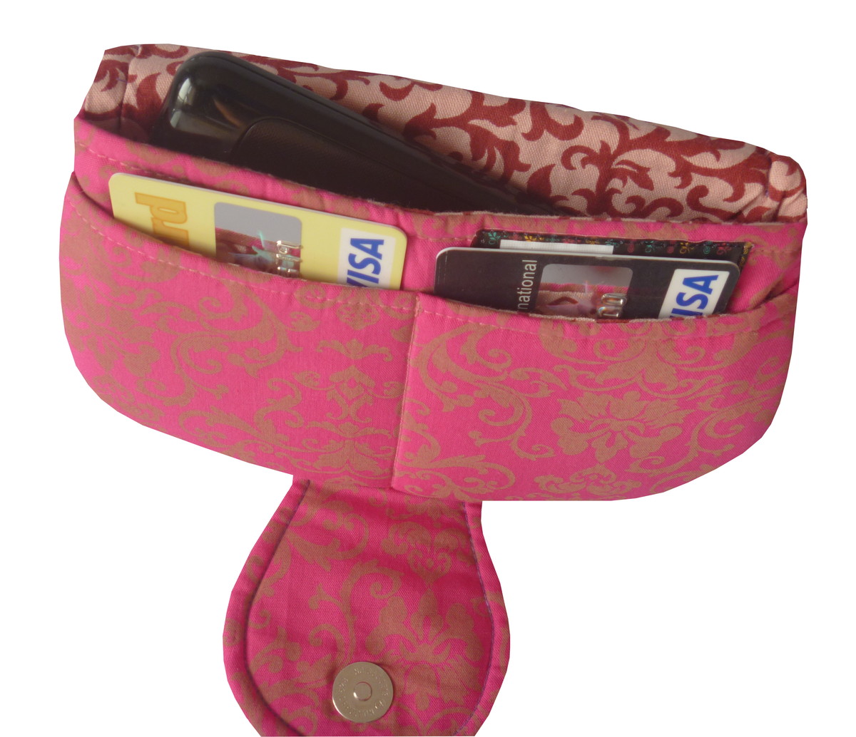 Três compartimentos internos, um grande para celular, e dois menores para cartões.