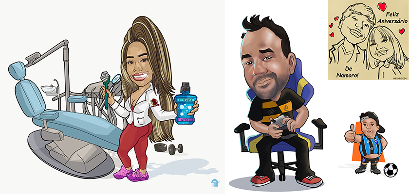 Nossas caricaturas são feitas no seu estilo e com o tema que você escolher, mantendo sempre o mesmo preço base. Caso deseje incluir um animal de estimação, veículo ou objeto adicional, será cobrado um acréscimo de R$ 20,00 por item no valor total. Para cenários mais complexos, o valor será definido conforme o nível de detalhamento solicitado.