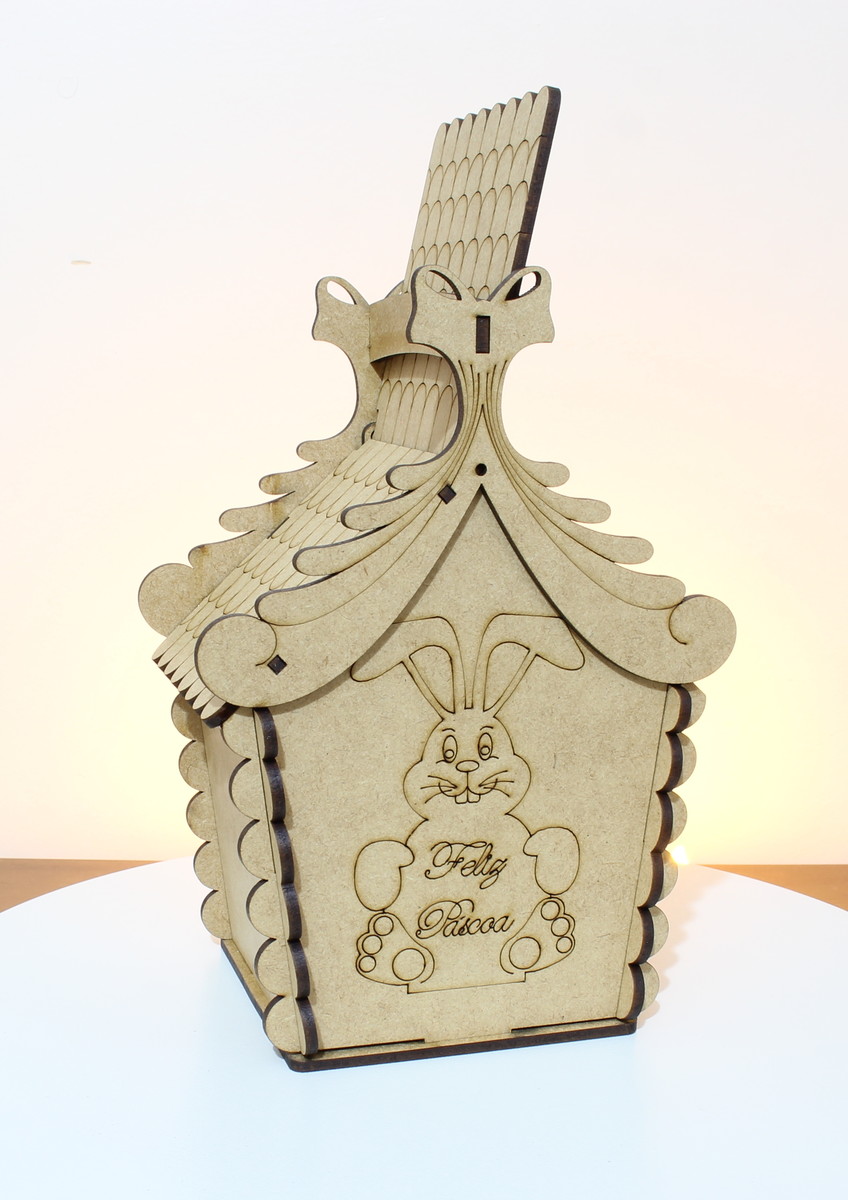Cesta de páscoa em mdf com tampa e alça, com 10 de largura, 14cm de comprimento e 20cm de altura .