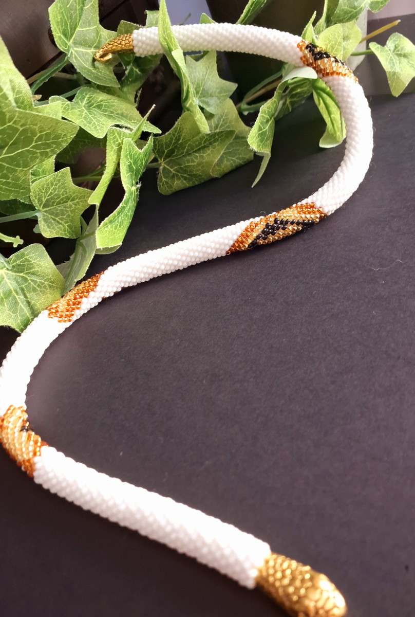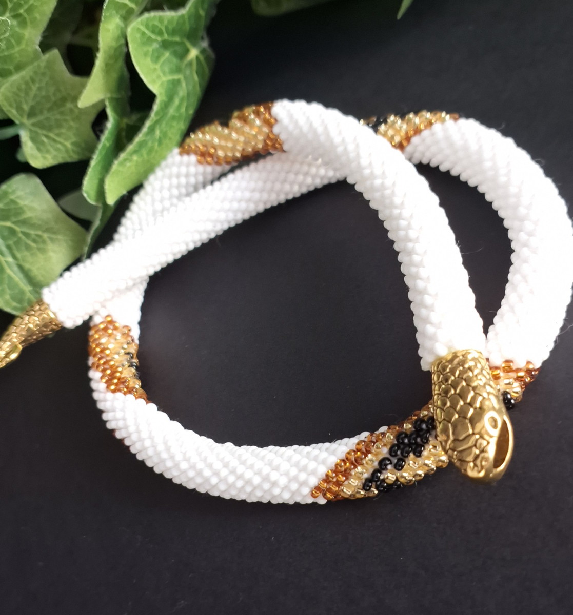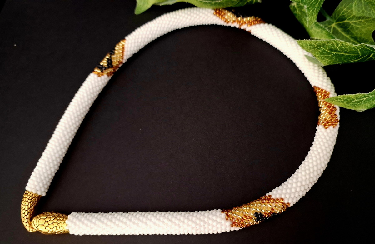 Branco, Preto e Dourado, com fechos de cabeça e cauda de cobra.