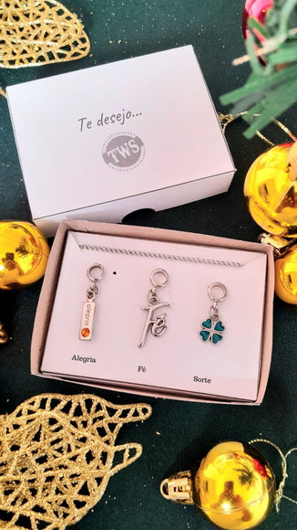 Colar com com Pingente Fé, Sorte, Aleg- Caixa Presente Frase Presente