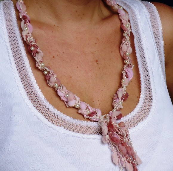 Delicado colar composto por linha (poliamida e algodão) em tons de rosa bordado com pérolas creme. Comprimento aproximado: 33cm.