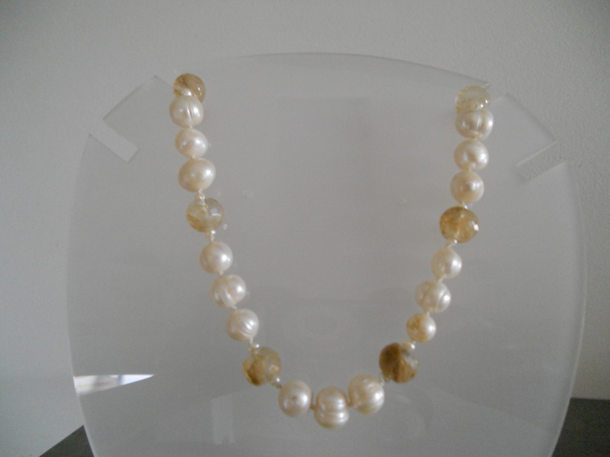 Colar confeccionado em pérolas cultivadas, tonalidade branca, com detalhes em pedra natural Quartzo Rutilado, 10mm.
