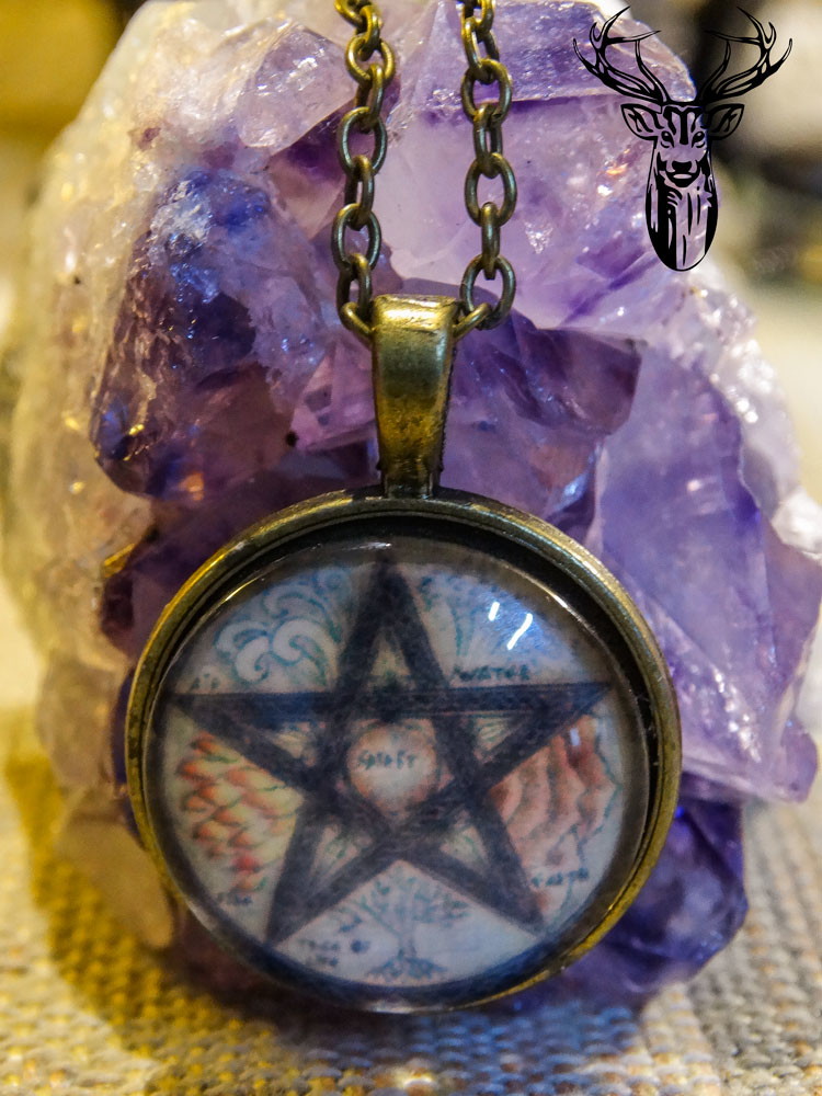 Colar Pentagrama com figuras dos Elementos e Árvore da Vida.