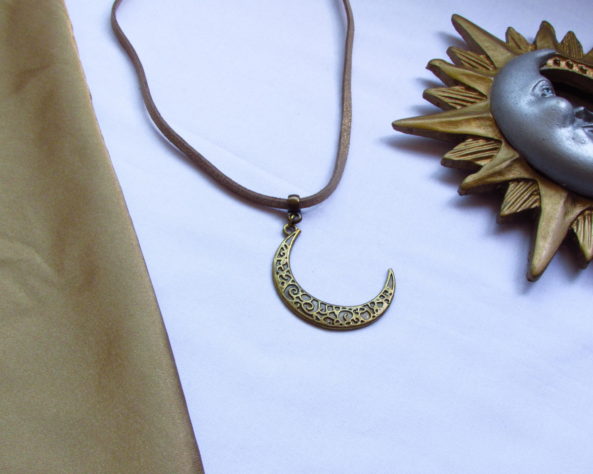 Colar em camurça dourada de 40 cm com pingente Lua crescente em banho ouro velho. Fecho lagosta. O produto acompanha embalagem para presente em papel kraft e laço de fita (cuja cor pode variar).