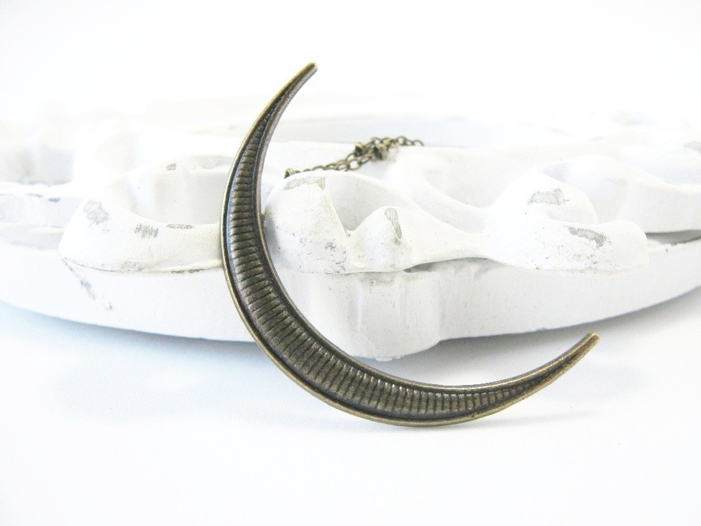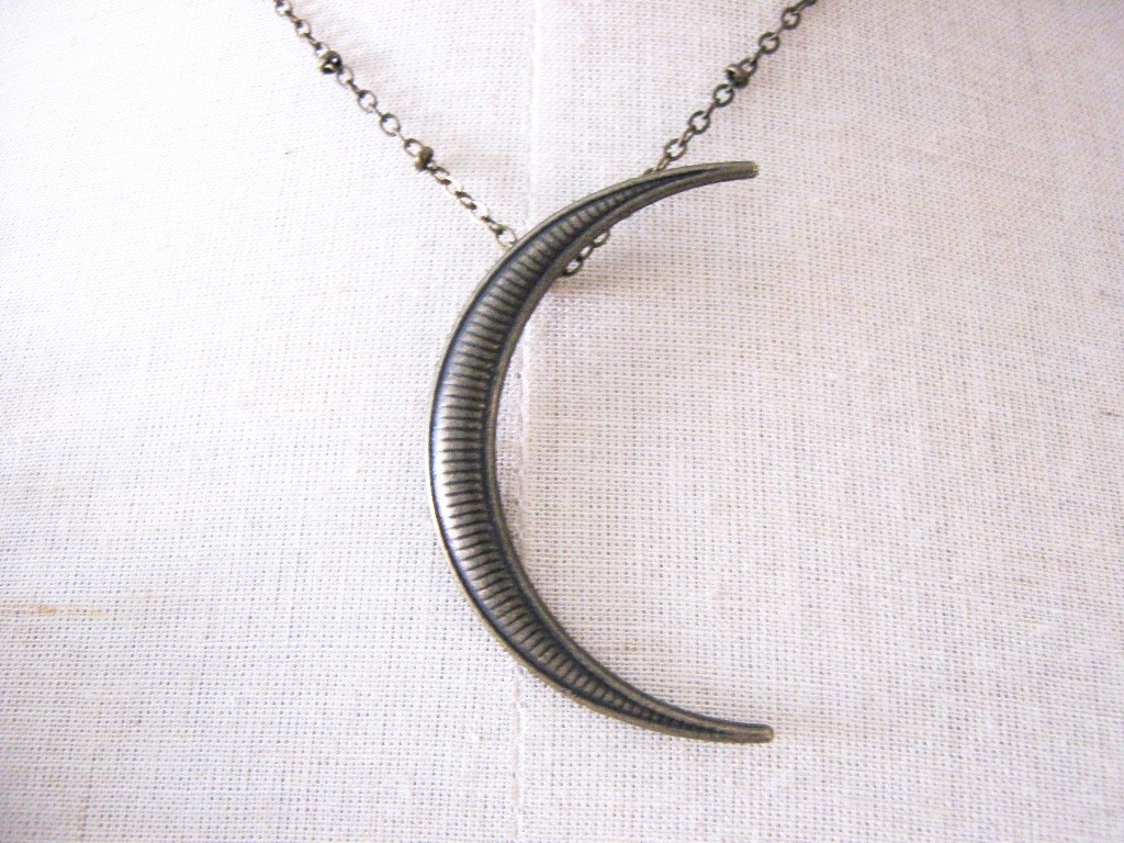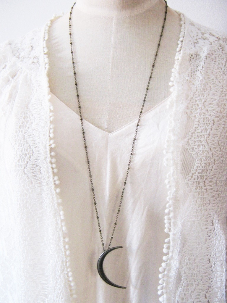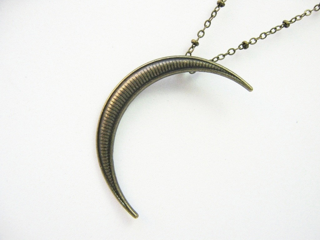 Colar longo com pingente em formato de lua crescente.