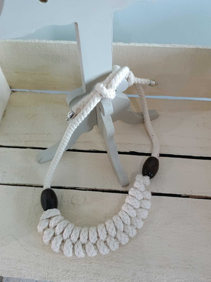 Colar macramé, em cordão de algodão de 1cm de espessura, com detalhe em madeira, ponteiras em metal niquelado, com fecho regulável