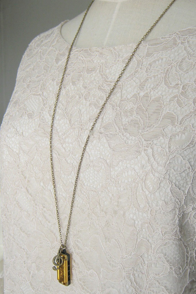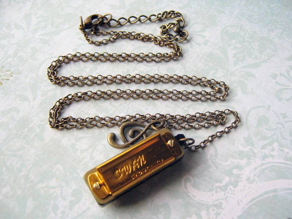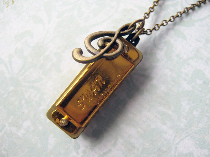 Colar com pingentes de mini harmônica ou gaita dourada e nota musical.